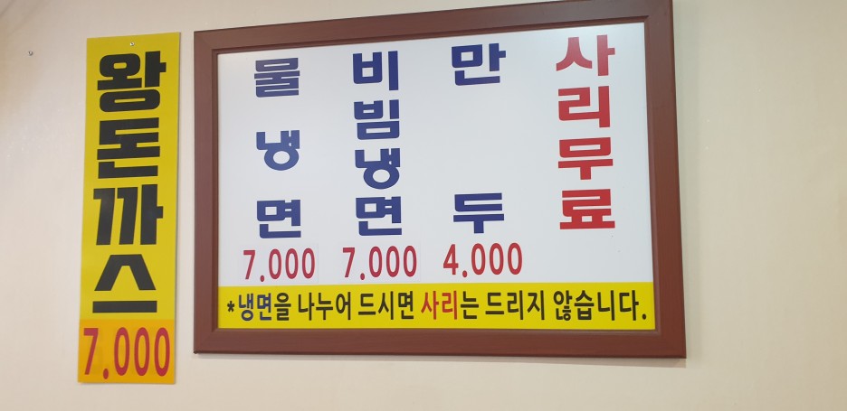 메뉴판을 보시면 왕돈까스 7,000원, 물냉면 7,000원, 비빔냉면 7,000원, 만두 4,000원 사리 무료