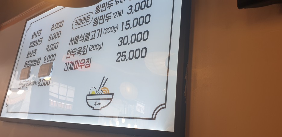물냉면 8,000원 / 비빔냉면 8,000원 / 회냉면 9,000원 / 육회비빔밥 9,000원 / 만두국 8,000원 / 불고기 15,000원
