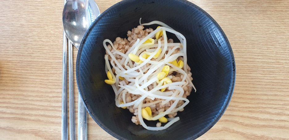 해물칼국수에 식전 빼놓을 수 없는 보리밥이 나옵니다. 토핑으로 콩나물이 들어가있네요