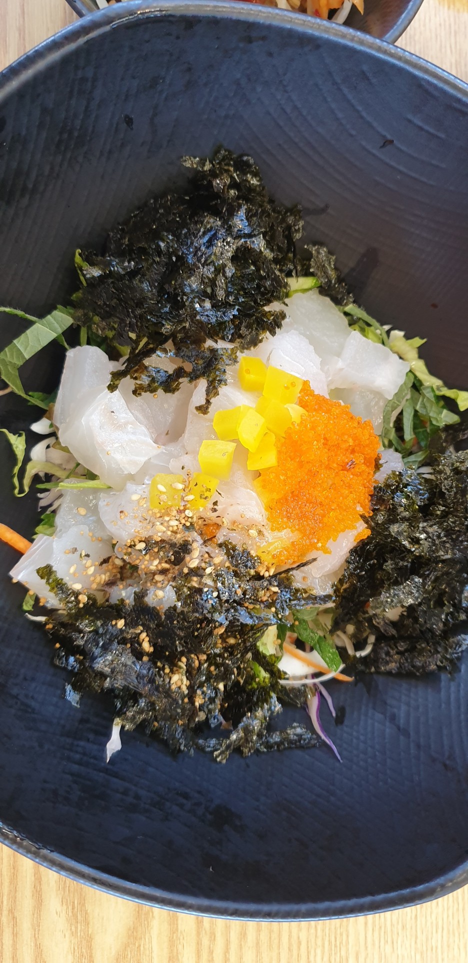 그사이 회덮밥이 나왔습니다. 공기밥은 따로나오고요 안에 내용물이 김가루, 회조각, 양배추, 상추, 단무지, 날치알이 나옵니다.