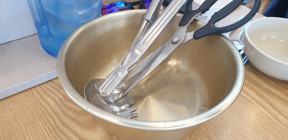 해물칼국수에 보조자 역활인 조개껍데기 그릇과 집게, 국자가 등장합니다.