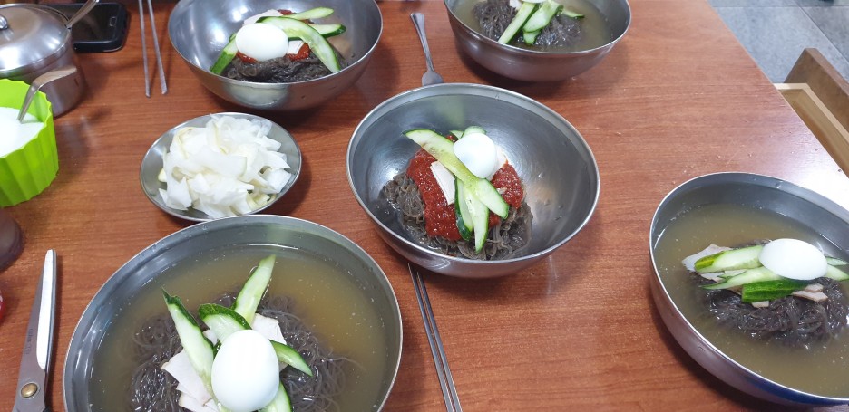 기다리던 냉면이나왔습니다. 비빔냉면 2개, 물냉면3개.. 물만두 2개(사진미첨부) 4인가족이 먹은 식사량입니다..