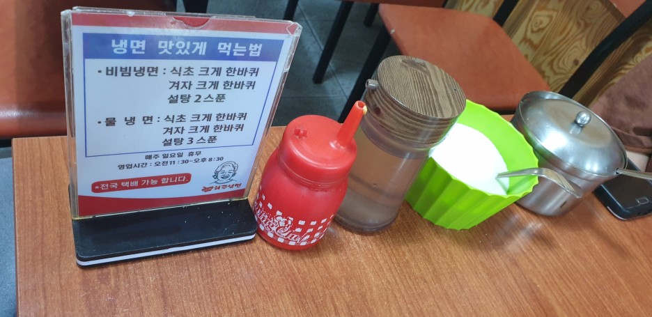 테이블에는 메뉴판 및 냉면 맛있게 먹는 법이 적혀있습니다. 아래 사진에 자세히 넣어 놓았으니보시면 되겠습니다.