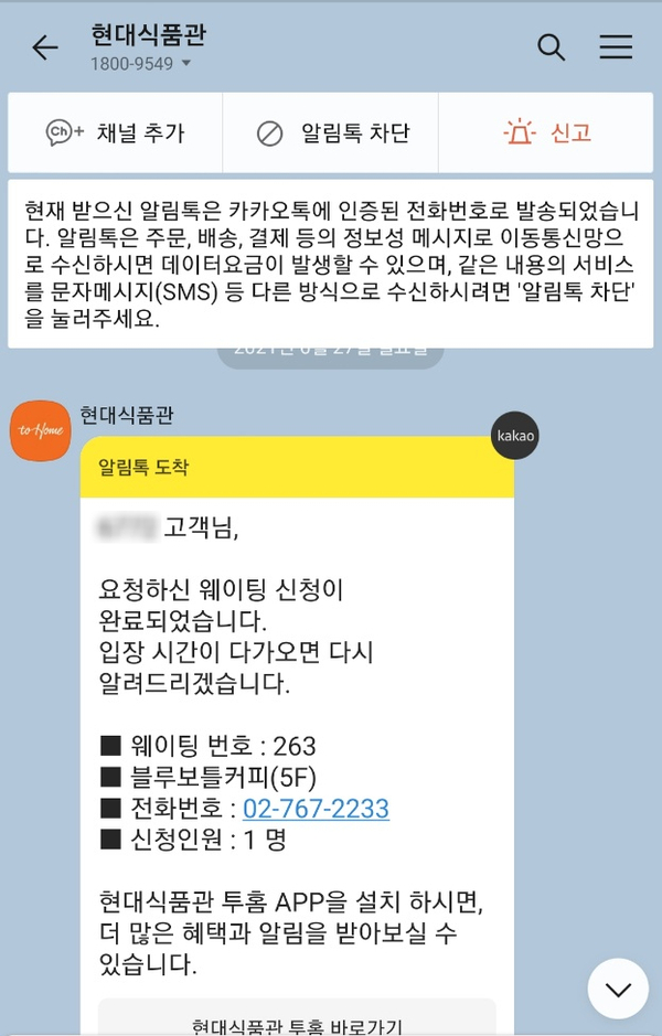 웨이팅등록하는 키오스크에서 핸드폰 연락처를 등록하였습니다. 그러면 카카오톡으로 쓱메세지로 전달해옵니다.