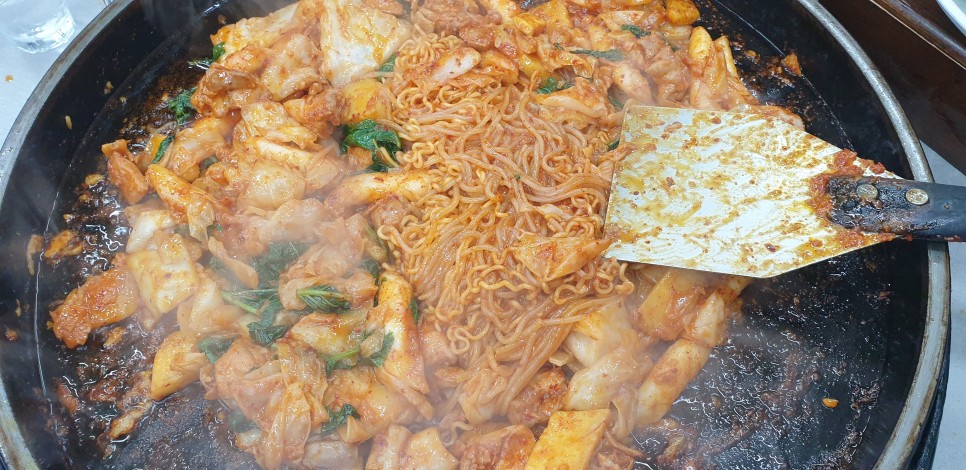 잘 볶아진 닭갈비에 여기에 라면사리와 쫄면사리를 투하 시킵니다.