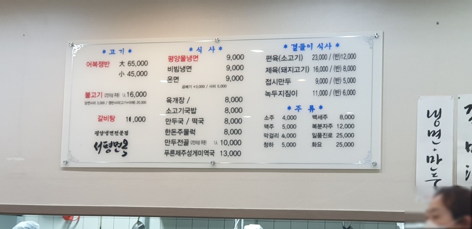 유리창문에 보이는 메뉴판.. 평양냉면 이라는 글귀가 저를 설레이게하네요.