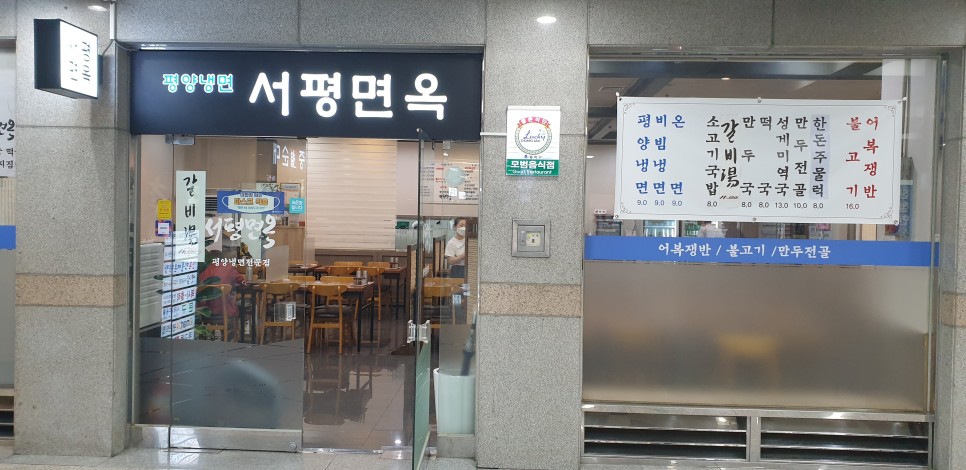 서평면옥 에 도착하였습니다 지하1층이라 간판이 심플하게 되어있더군요 색감이 이쁘네요 검정바탕에 흰색글씨 에 포인트로 녹색으로 평양냉면