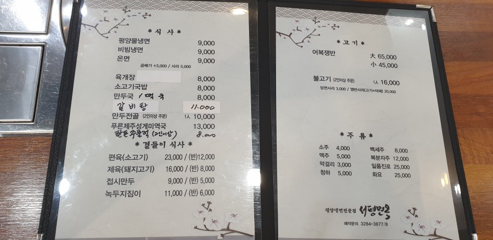 평양물냉면 9,000원, 비빔냉면 9,000원, 온면 9,000원, 육개장 8,000원, 소고기국밥 8,000원, 만두국/떡국 8,000원