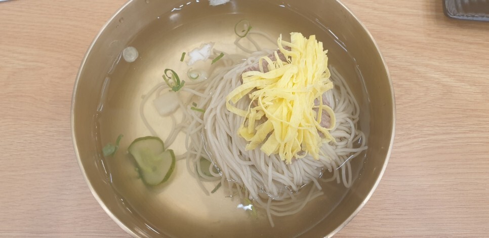 평양냉면이 나왔습니다. 오이절임이 육수안에 들어가 있으며,