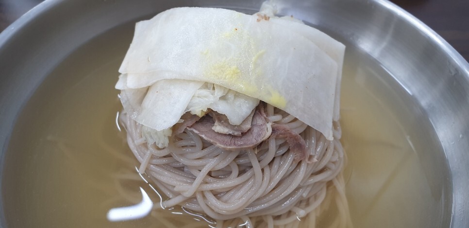 평양냉면이 나왔습니다. 육수가 약간 뿌연 느낌인데요