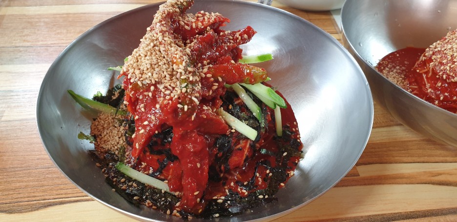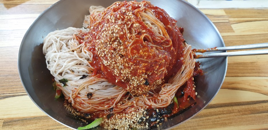순메밀명태비빔입니다. 개인샷으로 찍어보았습니다. 사진 보정도 없는데 이비주얼은 몬가요...