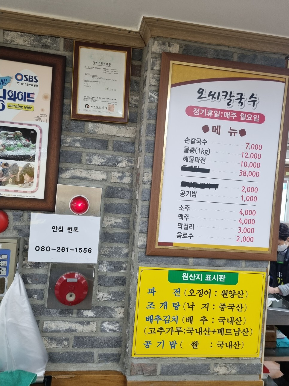 정기 휴일 매주 월요일 딱 유리창에 붙어 있으며, 간판에는 물총, 손칼국수, 조개탕등이 적혀 있습니다.
