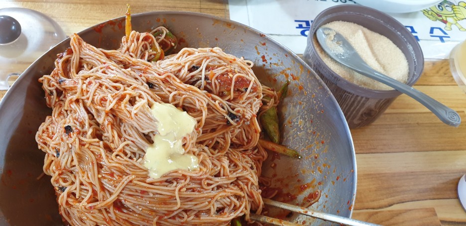 3가지로 비빔→ 비빔+양념(식초, 겨자, 설탕)→육수부어서 비빔물 변경으로 쓱~